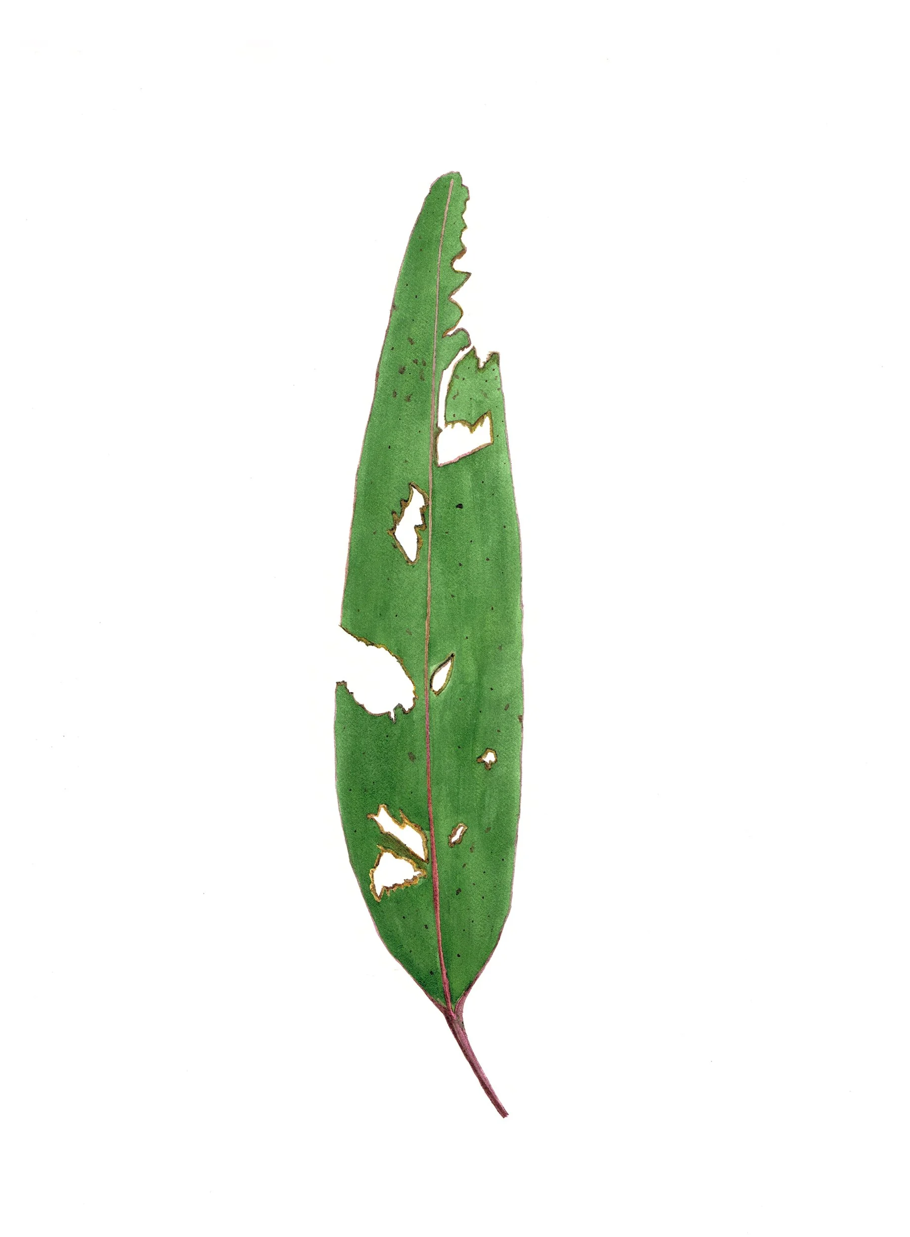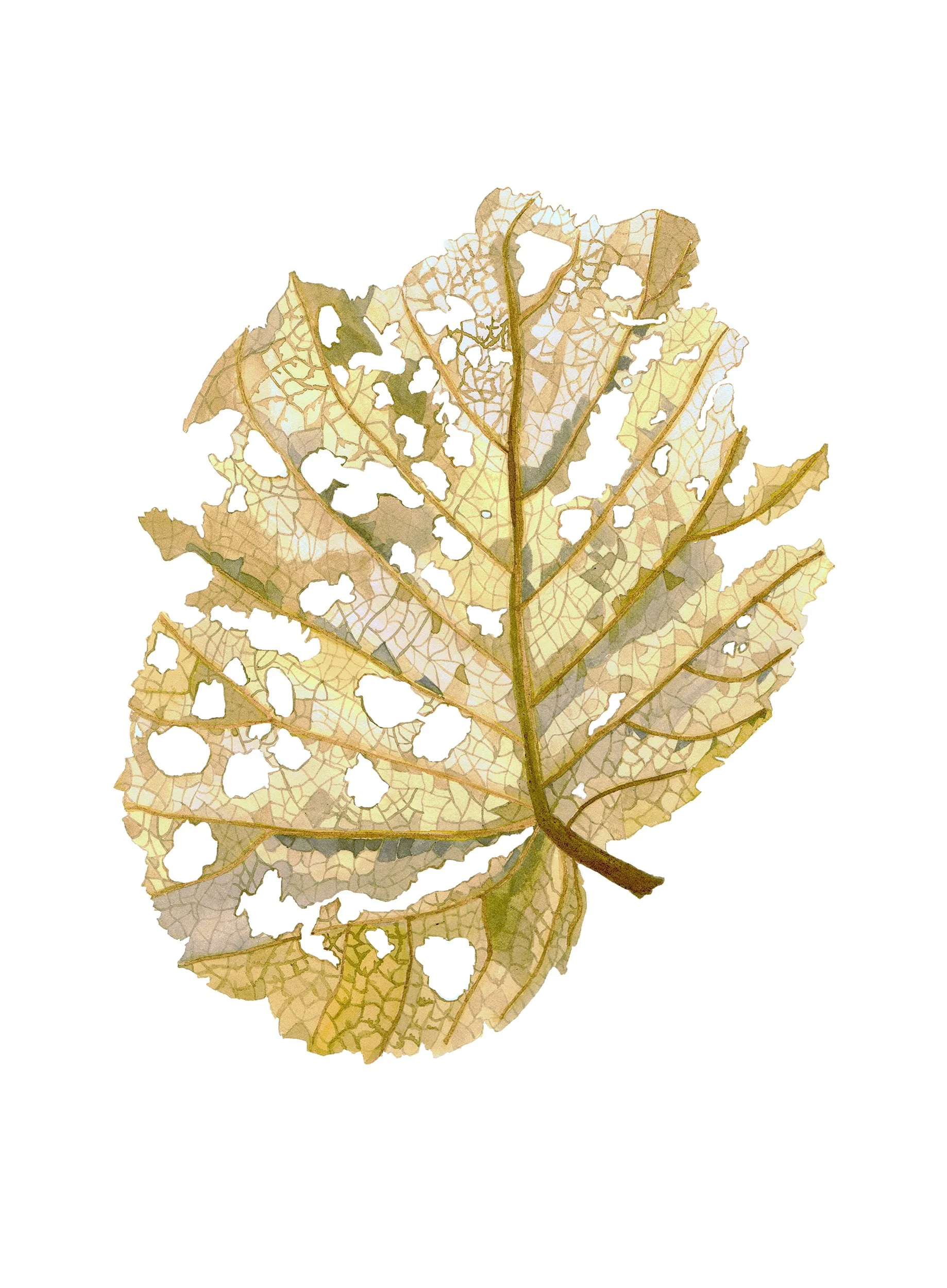 various found leaves. This series started in 2019 using a skeleton leaf found on a trip to Queensland back in 2015 as a source of inspiration. After enjoying the process of creating the leaf study out of ink, the series has continued using various found leaves from explored parks and gardens.